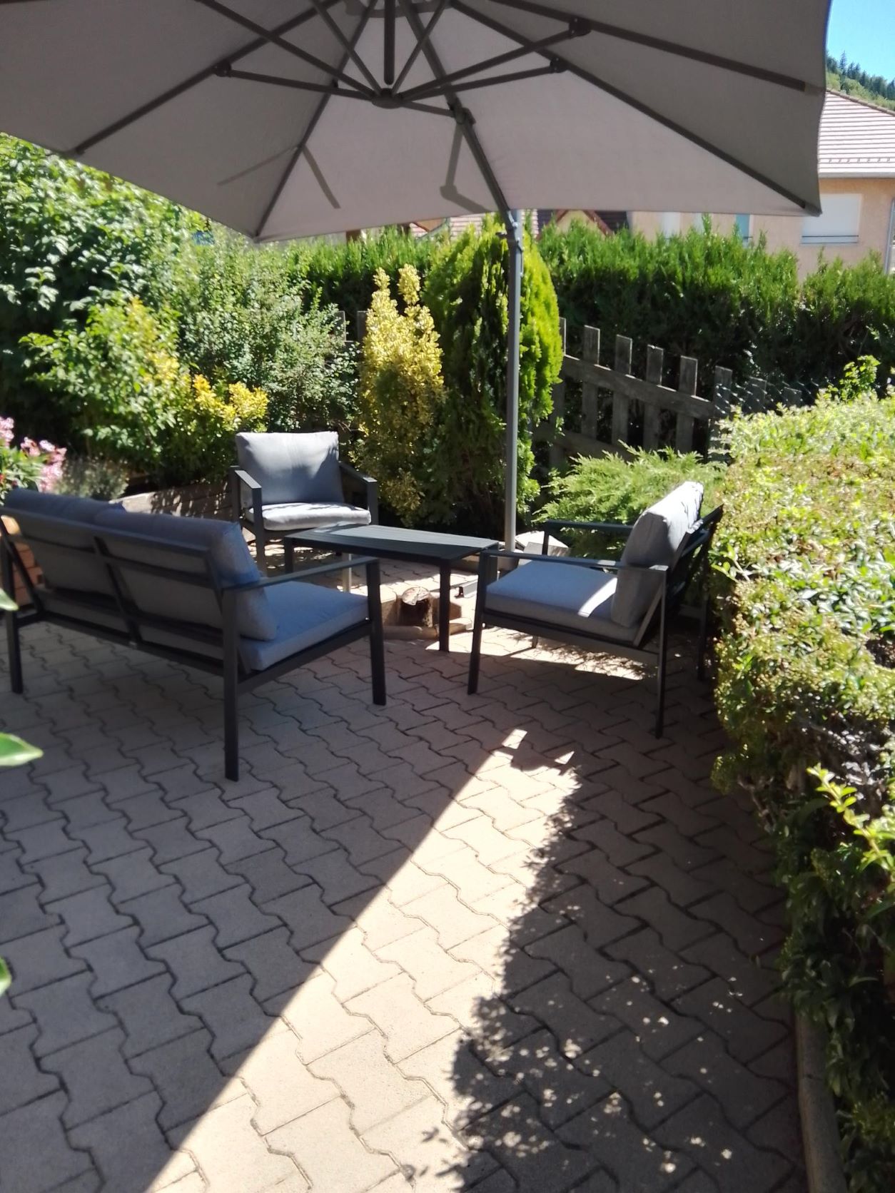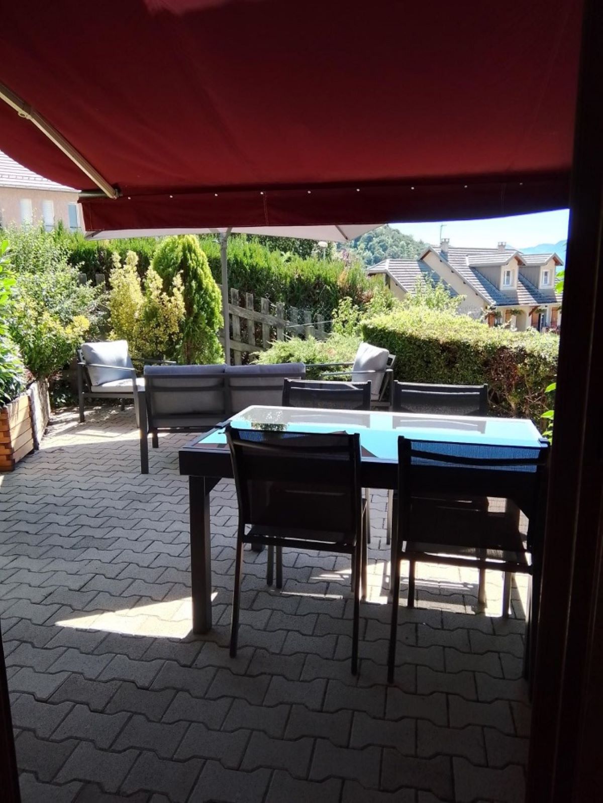 Grande terrasse équipée d’une table et 4 chaises, transats.