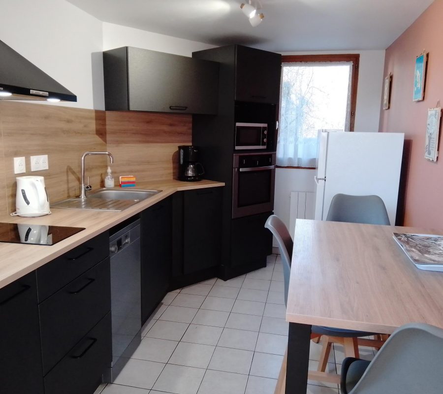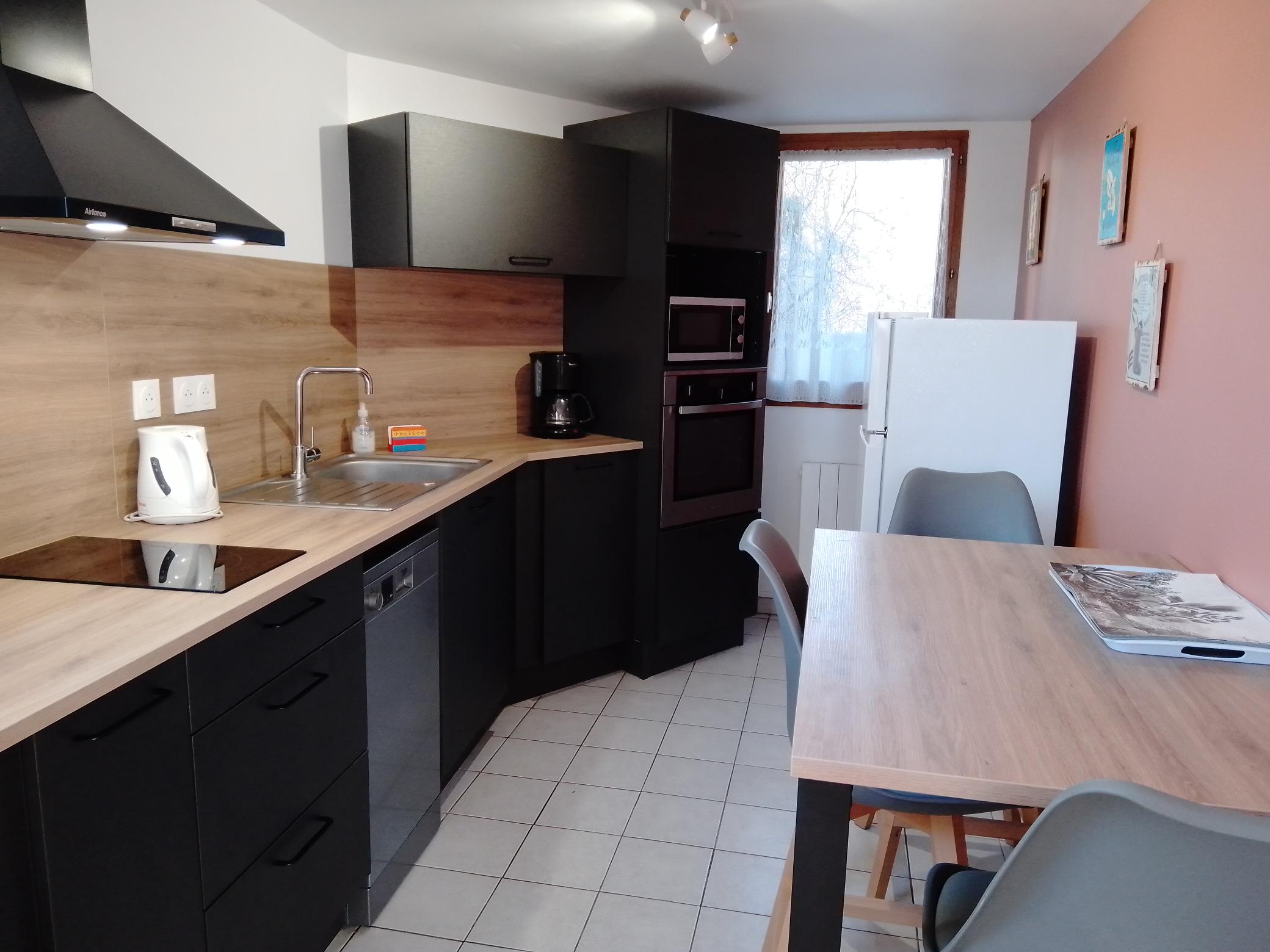 Cuisine équipée d’une plaque vitrocéramique, micro-ondes combiné et réfrigérateur avec compartiment congélateur.