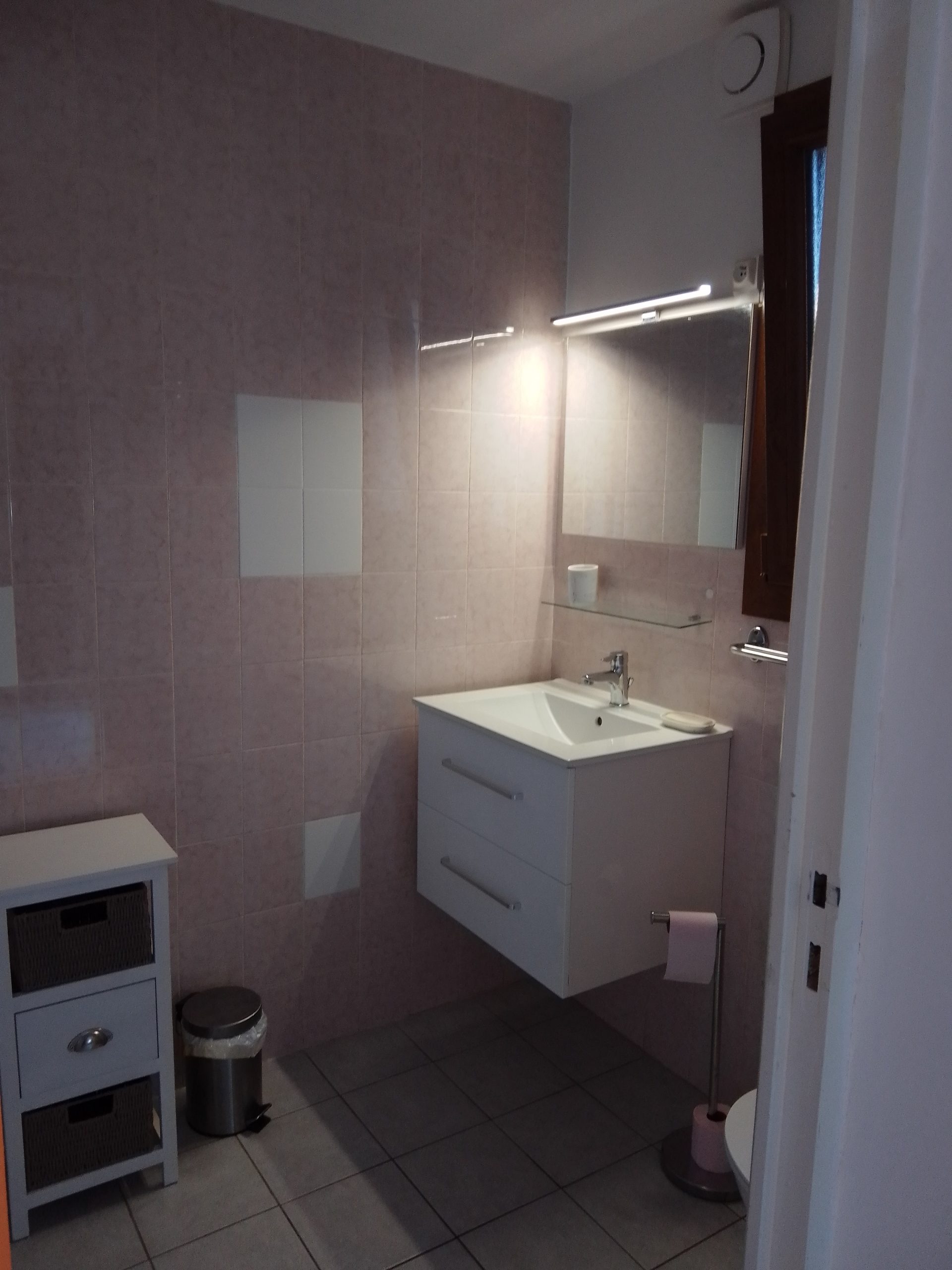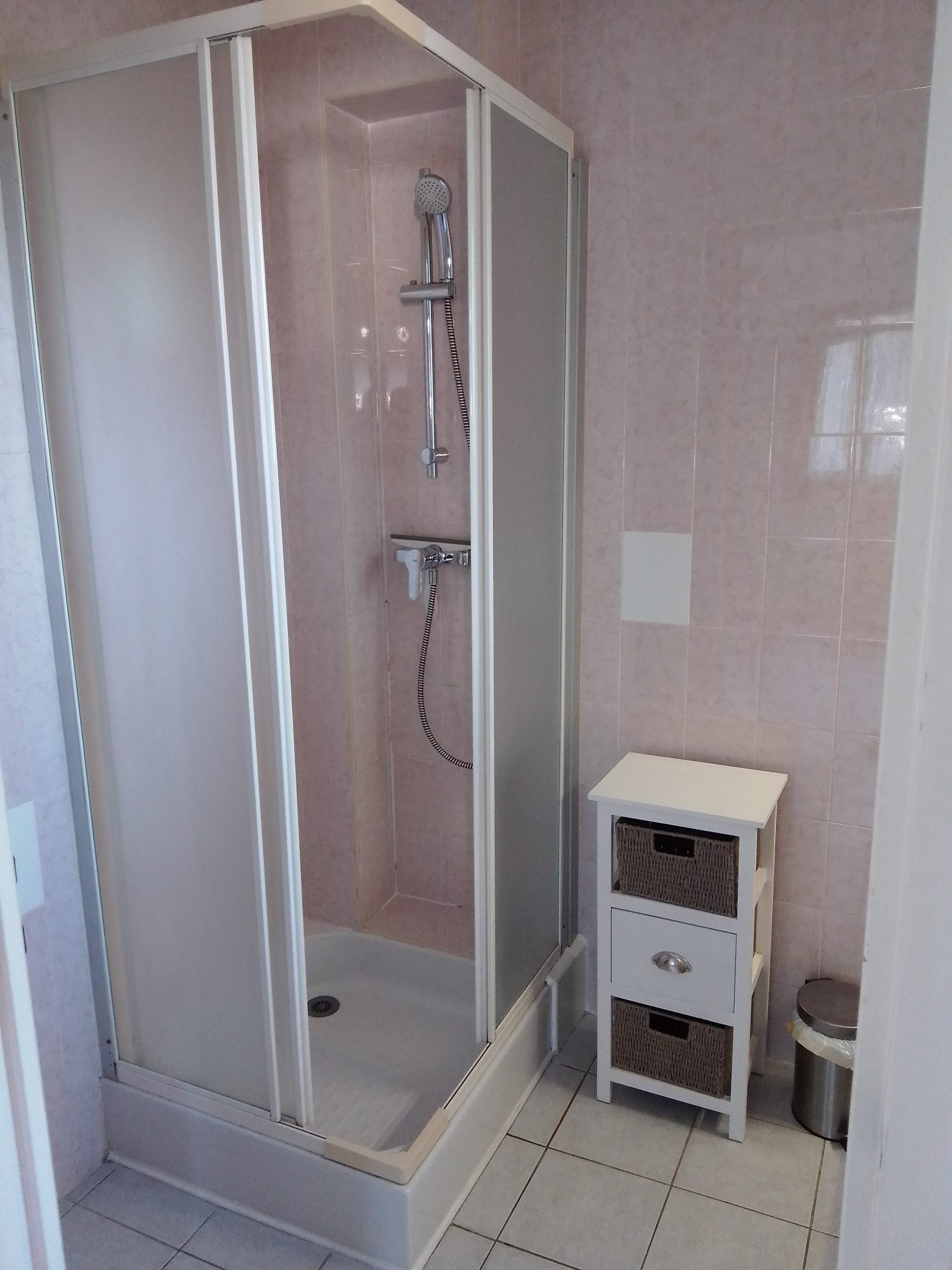 Salle de bain avec douche, WC et une salle de bains avec douche et WC séparé.