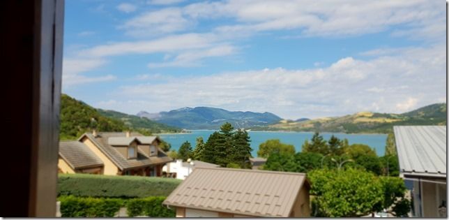 Grande terrasse avec vue sur le lac équipée d’une table et 4 chaises.